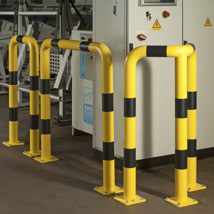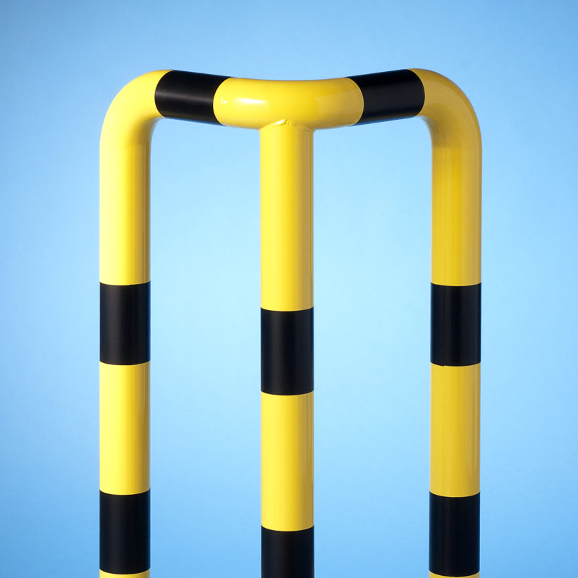 Innen- / Außenbereich: Spezifische Rostschutzbehandlung durch Verzinkung + zweifache Chromatierung + Epoxidpulverbeschichtung gelb mit schwarzen Signalstreifen.