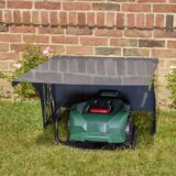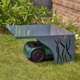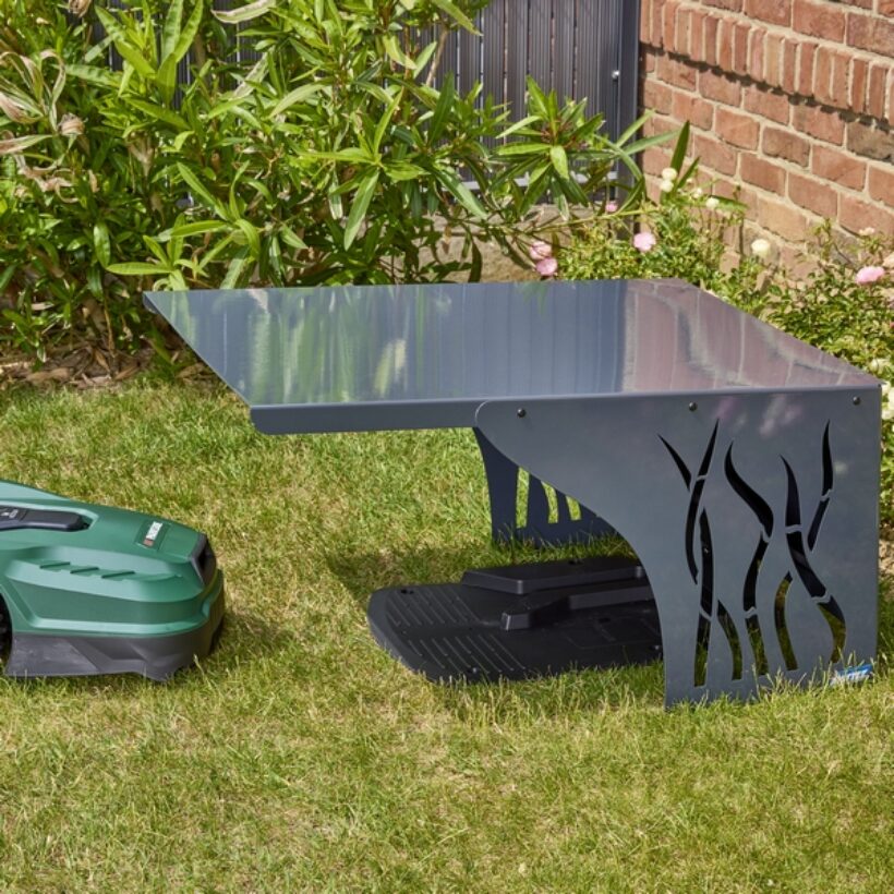 Grauer Unterstand für Mähroboter