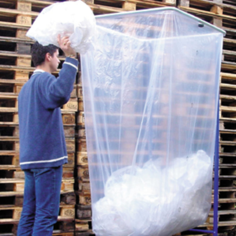 Der Sack wird durch Zusammendrücken des oberen Rohrs gehalten. Der Sack wird eingesetzt und das Rohr mit der Schraube festgezogen, um den Kunststoff zu spannen.