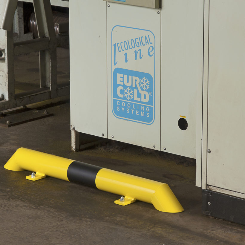low curbs XXL protection: tube Ø 89mm x 3.2mm thick Fastening with two 8mm thick plates with drill holes 13mm. Ends bevelled at 45 °. epoxy powder coated yellow with black warning stripes. Ø89mm length 80cm - Long. Overall 98cm
