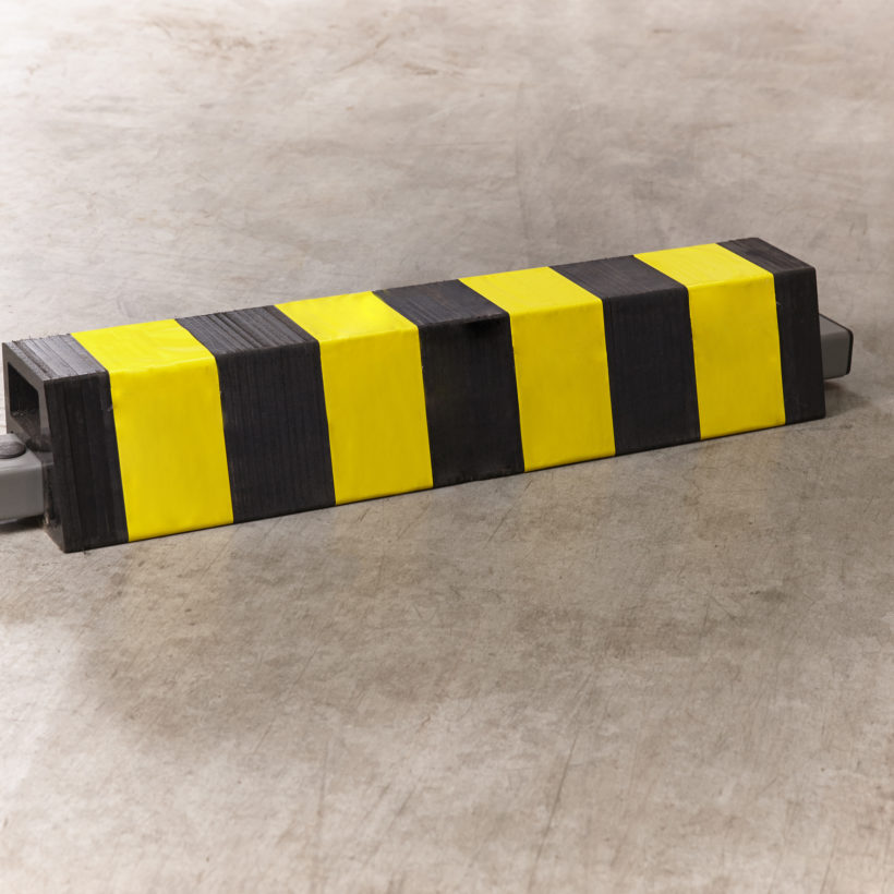 For the protection of production machines, conveyors, storage racks, cladding, walls or buildings. The stop is formed of a metallic rectangular frame tube, powdered polyester and coated with semi-flexible rubber members (18 strips of 5 cm wide and 2 sleeves). Is fixed to the ground with two M16 - 200 (not included) Height: 14.80 cm - width: 15cm - 100cm length steel reinforcement: 80x50