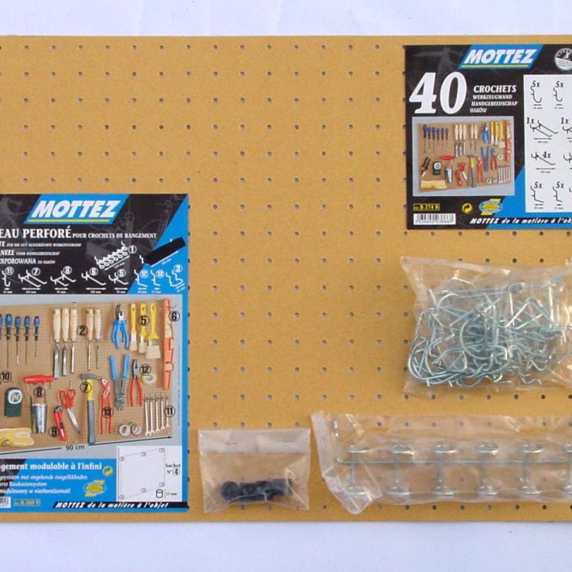 Kit panneau perforé isorel composé d'un panneau isorel + 1 lot de 40 crochets universels + 1 sachet de distanceurs + 1 barrette porte outils
