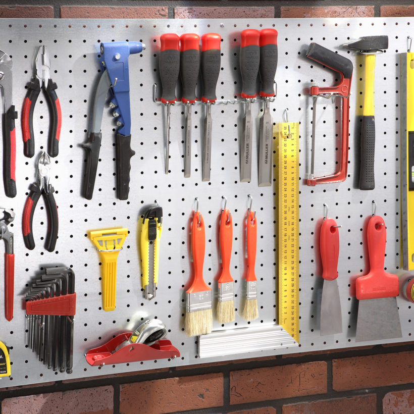 Kit pegboard sheet composed of a sheet metal panel 1 + Lot 40 universal hook + 1 sachet of spacers + 1 bar toolholders