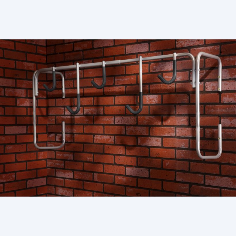 Permet de ranger 5 vélos suspendus au mur : gain de place important au sol.
